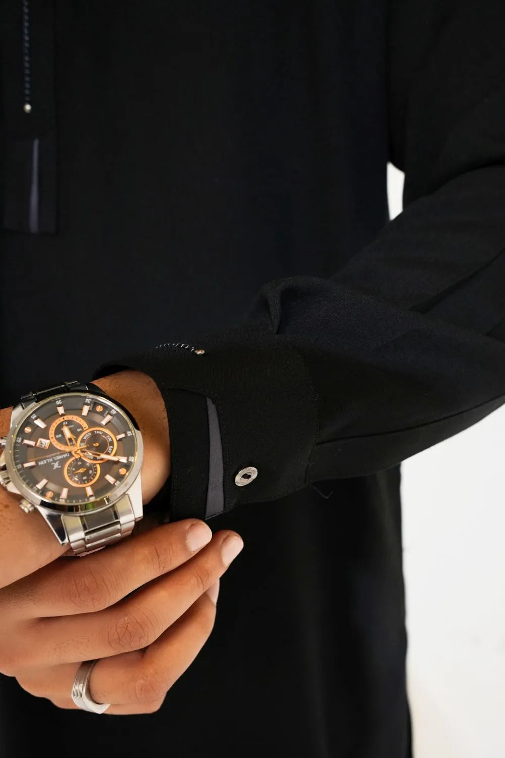 Step into Timeless Elegance with the Arshad Men Wear Black Wash and Wear Kameez Shalwar. Crafted from Premium Wash and Wear Fabric, this outfit ensures Effortless Comfort, Breathability, and a Crisp, Wrinkle-Free Look with minimal effort. The deep Black Tone exudes Classic Sophistication, perfect for Eid Prayers, Weddings, Formal Gatherings, or everyday style. Lightweight, durable, and Easy to Maintain, it blends Traditional Design with modern convenience. Elevate Your Wardrobe, add this essential black kameez shalwar to your cart today and stay polished effortlessly in every occasion!